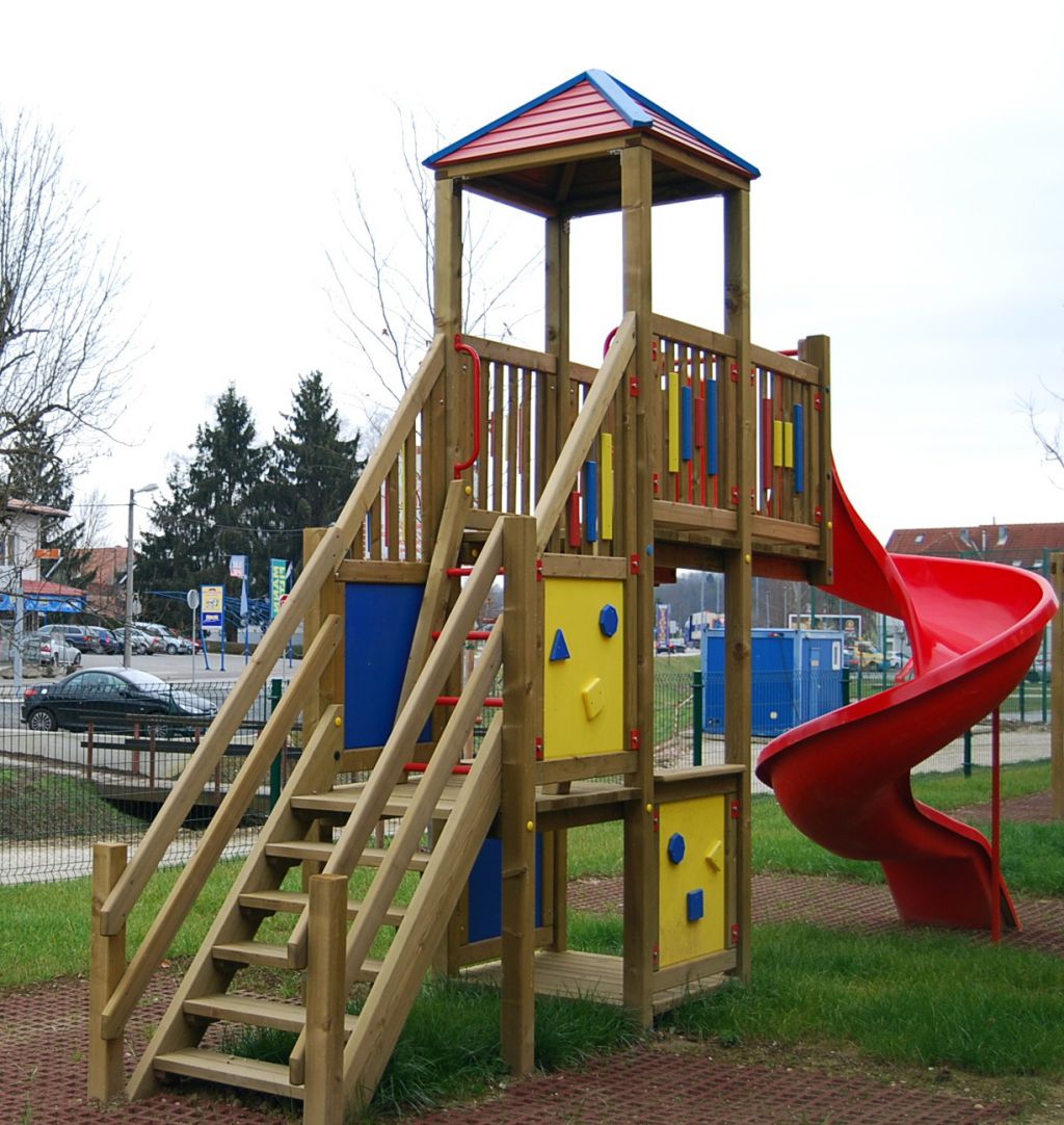 - stolp ima streho, podesta na dveh višinah in zaviti tobogan na višini 200 cm, ter dostop po lestvi in stopnicah z ograjo,