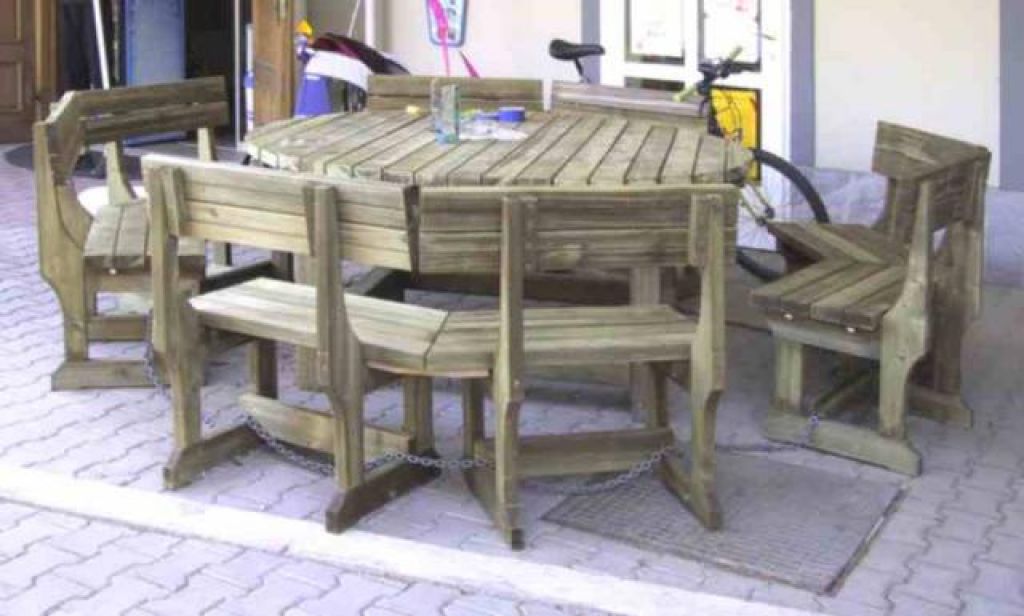 - sedežno garnituro sestavljajo okrogla miza premera 180 cm z močno in stabilno konstrukcijo, višine 75 cm in štiri kotne klopi s sedežno ploskvijo višine 45 cm in naslonom,