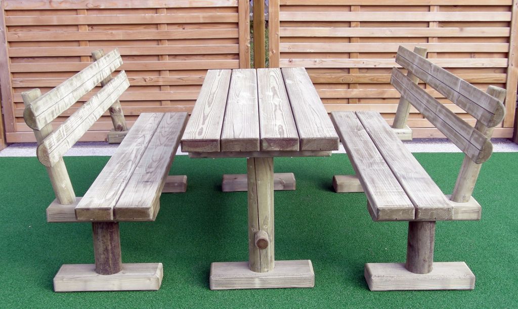 • sedežna in mizna ploskev sestavljena iz štiristransko skoblanih elementov, z nerjavečim vijačnim okovjem in nosilno konstrukcijo iz okroglega lesa,