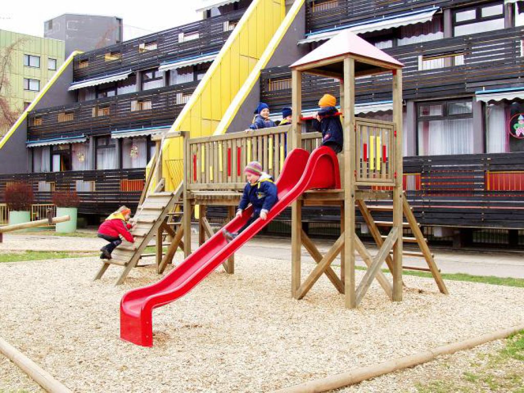 - en stolp ima streho, podesta in tobogan na višini 150 cm, ter dostop po lestvah in plezalni stenis plastificirano vrvjo s kovinskim jedrom,