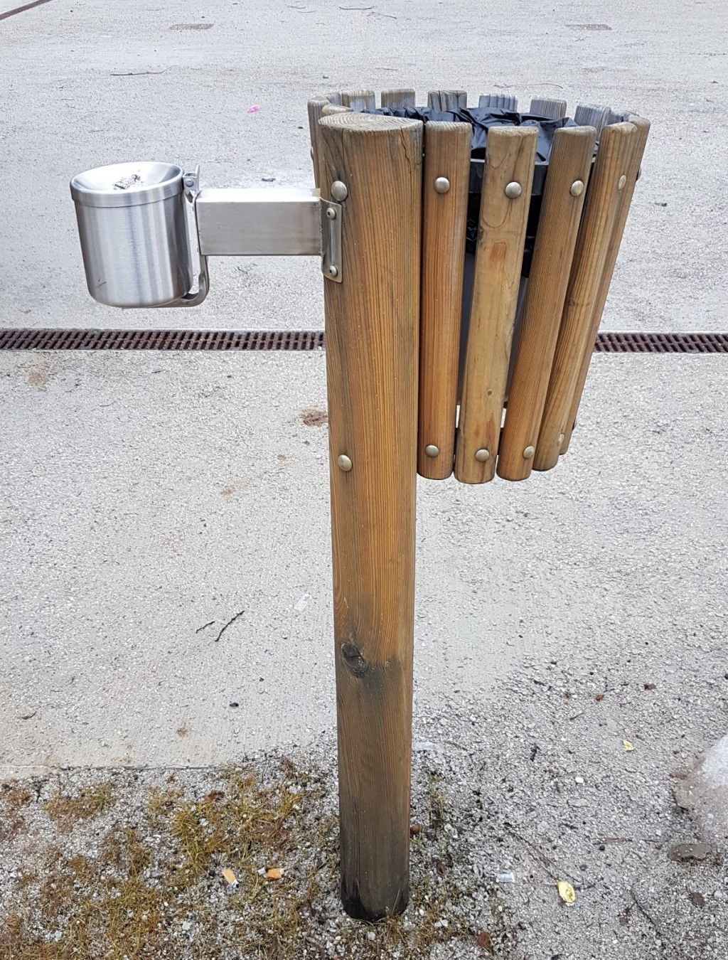 • izdelujemo ga v tipski dimenziji premera fi 31,5 cm, z vložkom - PVC vedrom in na nasprotno stran koša privijačenim nerjavečim pepelnikom,